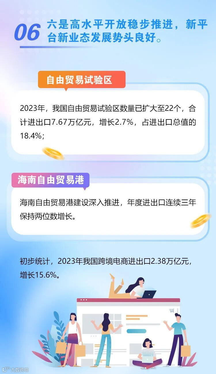 六是高水平开放稳步推进,新平台新业态发展势头良好。2023年,我国自由贸易试验区数量已扩大至22个,合计进出口7.67万亿元,增长2.7%,占进出口总值的18.4%;海南自由贸易港建设深入推进,年度进出口连续三年保持两位数增长。初步统计,2023年我国跨境电商进出口2.38万亿元,增长15.6%。