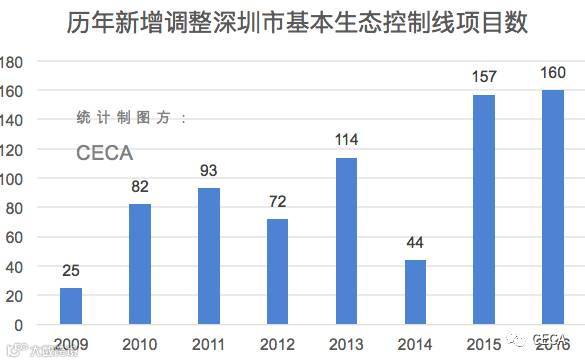 首先,我们CECA搜集整理了深圳市规划和国土资源委员会自2009年6月(此前没有网上公示)至2016年12月间的全部“占用基本生态控制线”公示,得出了惊人的事实: