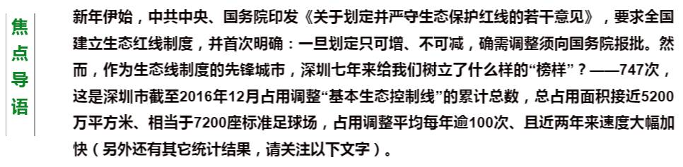深圳市基本生态控制线(以下简称“生态控制线”)设立于2005年、更新于2013年,是为了保障城市基本生态安全、维护生态系统的可持续性而划定的范围界线,多为森林、湿地、人造绿地、海岸红树林等。属于深圳自己的“自然保护区”,也是中国内地试行划线保卫生态的先锋。然而,如今深圳的生态线范围内已遍布建设项目,侵占和调整次数越来越频繁,先锋模范近乎成了“反面教材”。(编者注:基本生态控制线的主管部门是深圳市规划和国土资源委员会)。