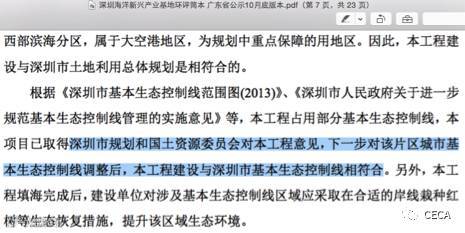 >> 填海计划侵占陆地生态线。“深圳市海洋新兴产业基地项目”——在填海砍伐红树林、滨海湿地的基础上,还需占用宝安区基本生态控制线范围约50 - 100公顷(精确数字未公示,位于海上田园以西),有关环评报告已提出须向深圳市规划和国土资源委员会申请调整方才“合法”,并已得到了“默许”(参见下图环评截屏)。