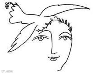 1940 年,希特勒法西斯攻占了法国首都巴黎。一天,著名画家毕加索正忧郁地坐在画室里。这时邻居米什老人来到画室,只见老人手捧一只鲜血淋漓的鸽子,向毕加索讲 述了一个悲惨的故事。他的孙儿正招引鸽子,却被一群法西斯匪徒活活地打死了,连鸽子也全都被掐死了!老人讲到这里,对毕加索说到“先生,我请求您给我画一 只鸽子,以纪念我那惨遭法西斯杀害的孙子”。随后,毕加索怀着悲愤的心情,挥笔画出了一只飞翔的鸽子——这就是“和平鸽”的雏形。