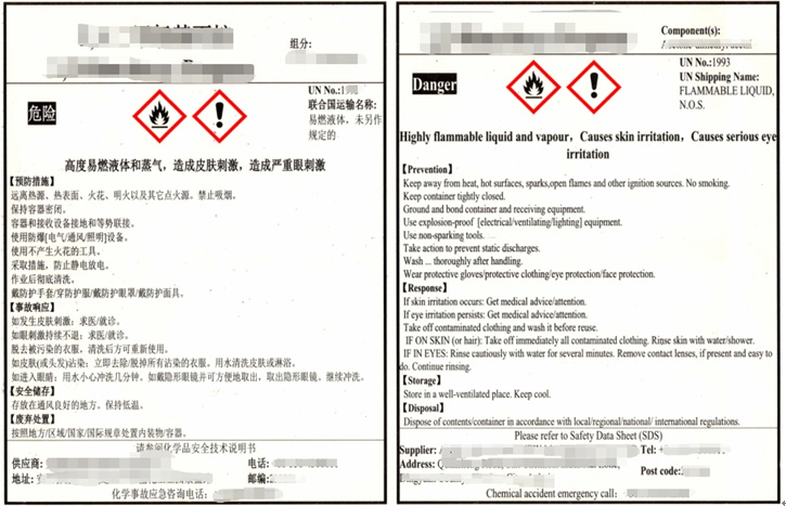 按照《全球化学品统一分类和标签制度》(GHS)的定义,危险公示标签是指关于危险品的一组相应的书面、印刷或图形信息要素,因与目标部门相关而选定,标签固定、印刷或附着在危险品的直接容器上或外包装上。