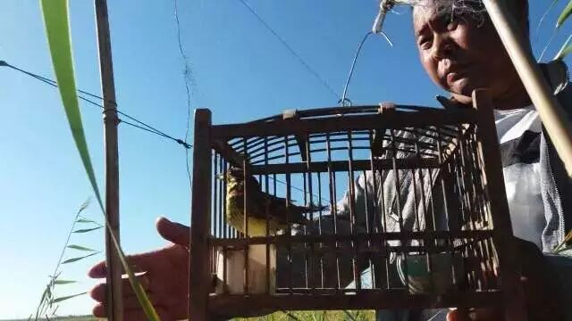 爱鸟胖哥正在解救捕鸟网旁的鸟诱子。