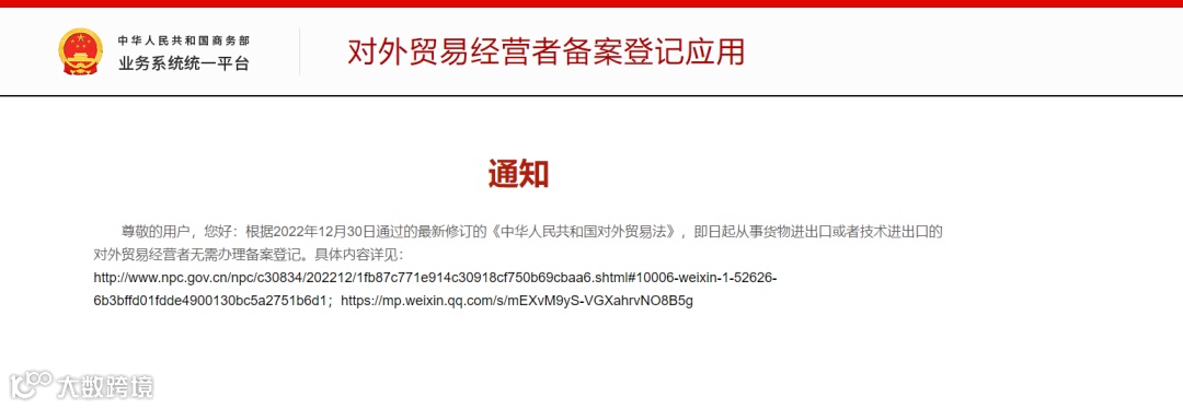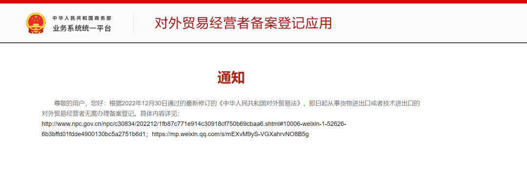 2022年12月30日,十三届全国人大常委会第三十八次会议经表决,通过了关于修改对外贸易法的决定,删去《中华人民共和国对外贸易法》第九条关于对外贸易经营者备案登记的规定。根据决定,自2022年12月30日起,各地商务主管部门停止办理对外贸易经营者备案登记。