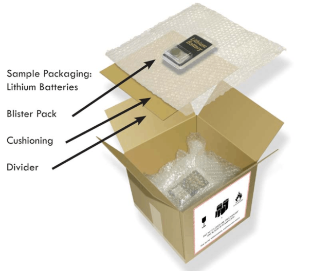 电池芯和电池必须放置于可将其完全封闭的内包装中,再放入坚固硬质外包装,每个包装件必须能承受任意方向的1.2米跌落试验。标注(UN 3480, PI965 Section IA or IB)的锂电池和锂金属电池(UN 3090, PI968 Section IA or IB)不允许与第1类爆炸物质、第2.1类易燃气体、第3类易燃液体、第4.1类易燃固体、第5.1类氧化剂等危险品货物包装在同一个外包装中。具体按照《危险品航空安全运输技术细则》965-970项执行。