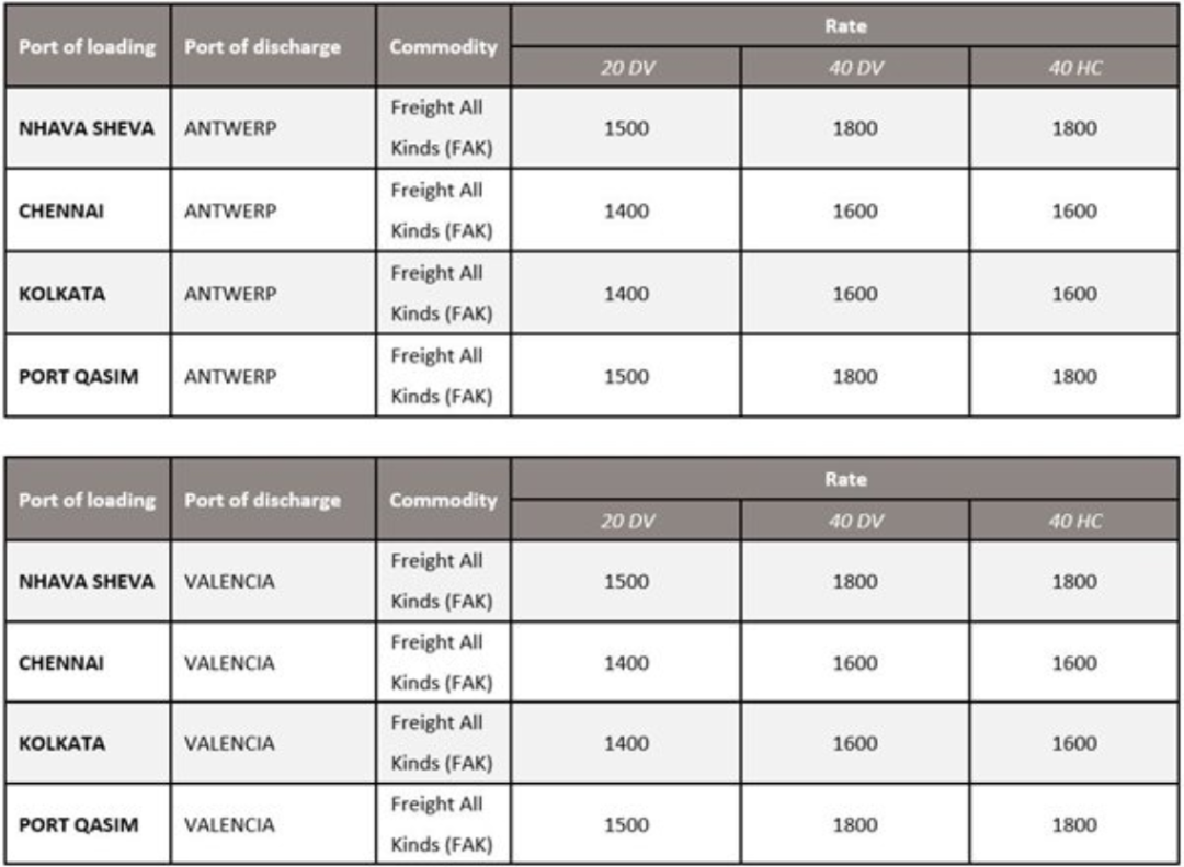 MSC9月1日起执行下列运价,直至另行通知,但不得超过9月30日。