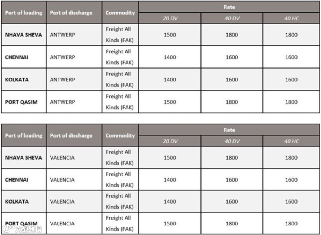 具体费率:USD 500/20' | USD 1,000 / 40'
