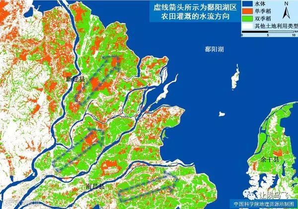 鄱阳湖农田最为集中的区域(南昌县、新建县),农田灌溉的主要来源是赣江,而不是鄱阳湖。通常由赣江中引水,灌溉后再流入鄱阳湖,而不是相反。 姜鲁光制图