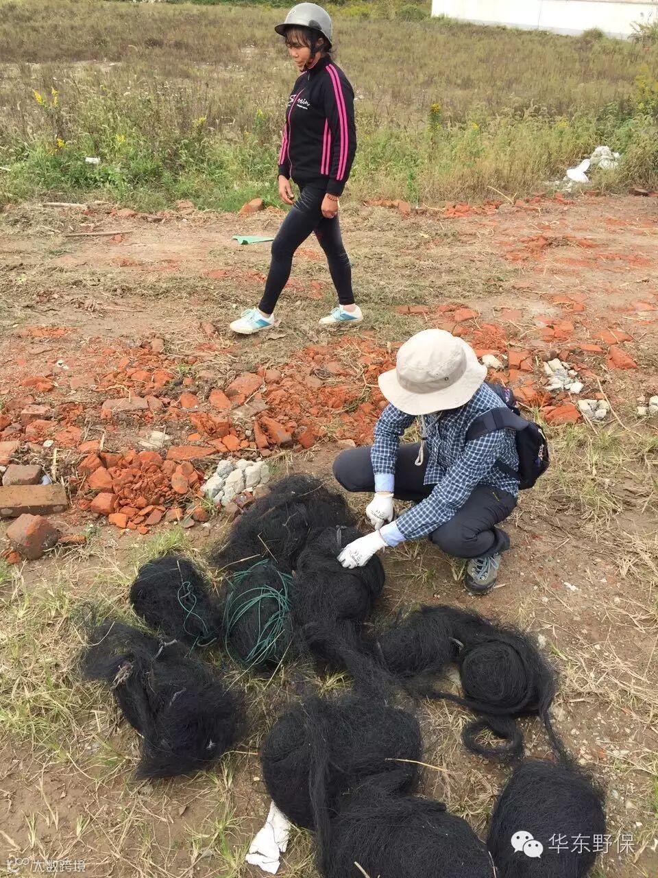 一名瘦小的女志愿者,吃力的提着满满一大袋鸟网往外走