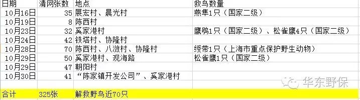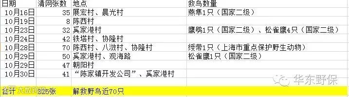 冻鸟线索中断令人深感遗憾,但无论如何,陈家镇,或是以陈家镇为代表的崇明县,捕鸟、吃鸟现象之猖獗,早已是冰冻三尺非一日之寒。此处多个村落近林沿海,又有著名的东滩候鸟保护区和湿地公园,一直是东亚-澳大利西亚鸟类迁徙线上较为重要的落脚点;上海清网志愿者也一直将崇明作为最主要的巡护地,仅10月下旬的一部分数据就足以令人乍舌——