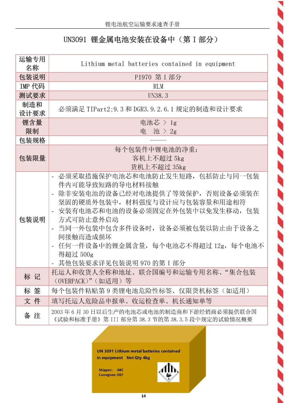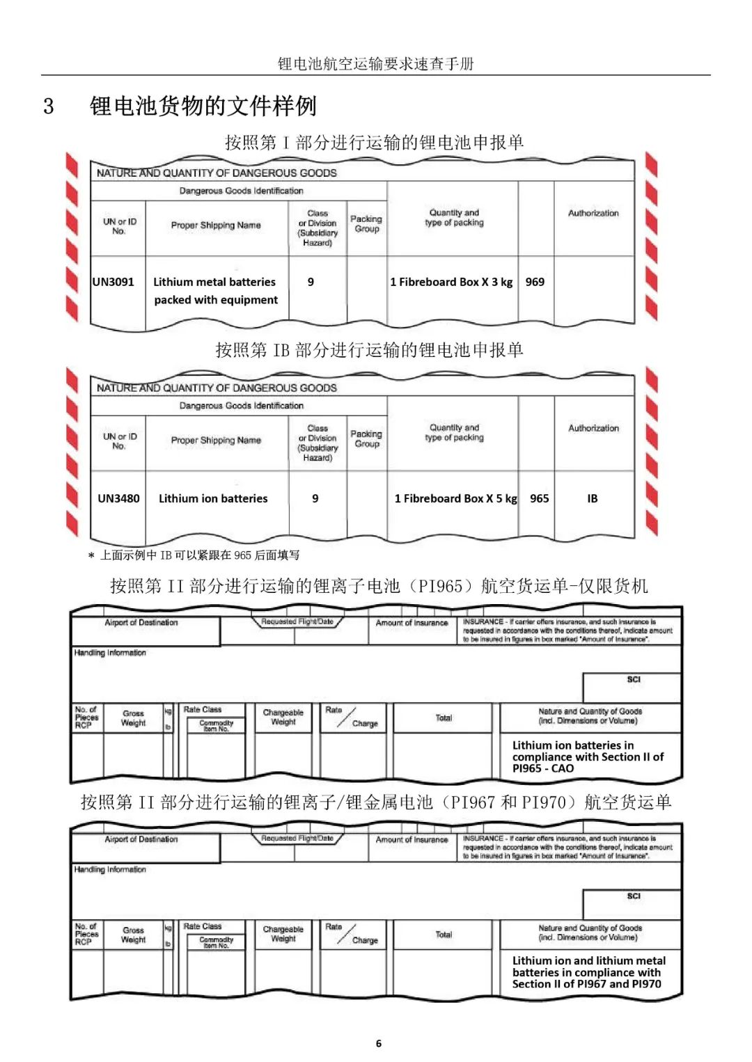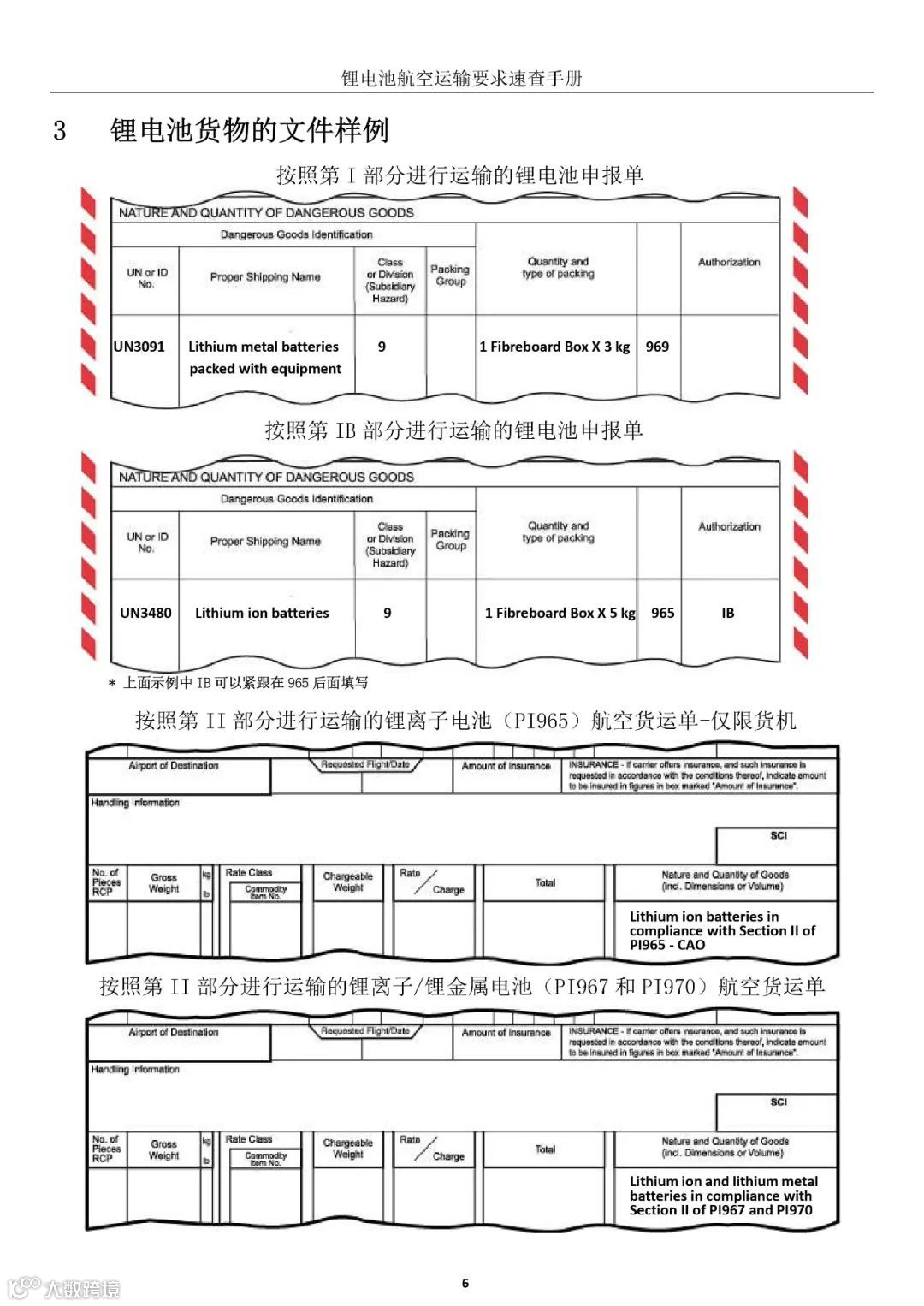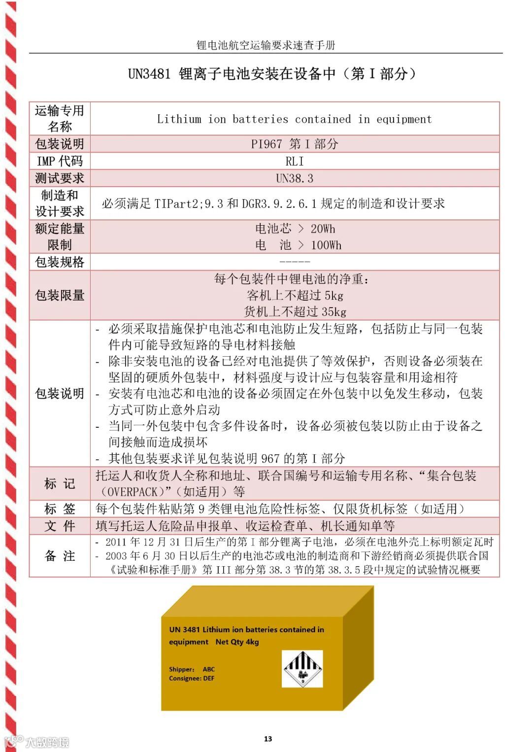 必须确保设备在外包装中不能移动;如包装中有多件设备的必须包装牢固在一起,以防止与包装中的其他设备接触而造成损坏。还修改《托运人声明》Shipper's Declaration(10.8.8.1)中提供危险货物时的航空货运单声明。
