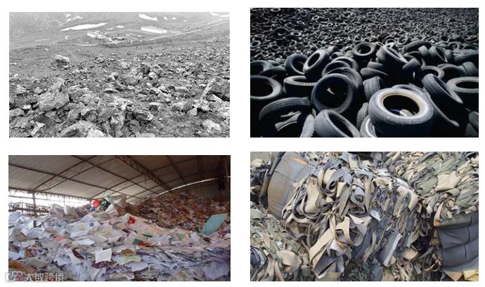 工业生产中常见的固体废物(废石、废轮胎、印刷废纸、废皮革等)