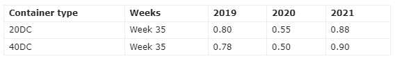 洛杉矶港的CAx在20DC和40DC分别为0.88和0.90,根据Container xChange的定义,CAx超过0.5说明该港口的集装箱设备有剩余,而低于0.5时则表示设备不足。这是过去3年监测到的的港口的最高集装箱可用性CAx值。
