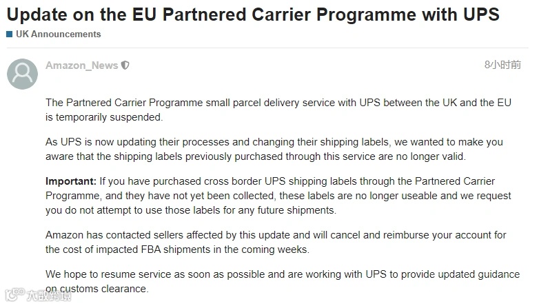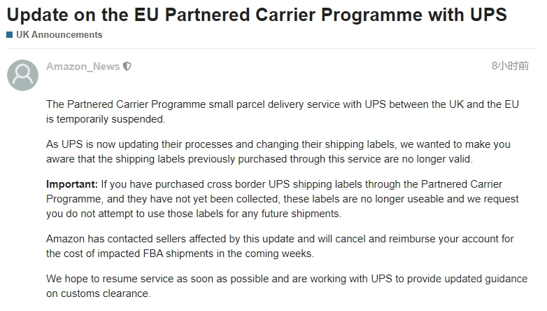 据悉,日前亚马逊英国站发布公告,宣布将暂停与UPS在英国和欧盟之间合作的小包裹递送服务,亚马逊表示目前已通知相关卖家。