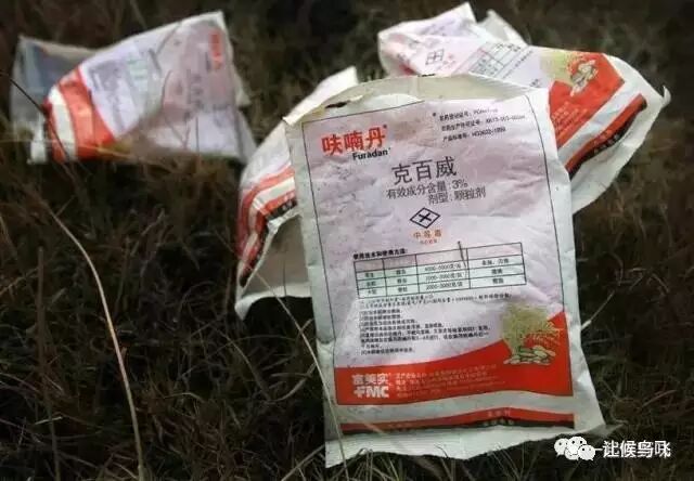 许多登上人们餐桌的野生鸟类均为毒药致死,其中,呋喃丹是当前使用最频繁的毒药。呋喃丹又叫大扶农、克百威、虫螨威,属于高毒性农药,其毒理机制为抑制胆碱酯酶,但与其它氨基甲酸酯类杀虫剂不同的是,它与胆碱酯酶的结合不可逆,对人、畜高毒。