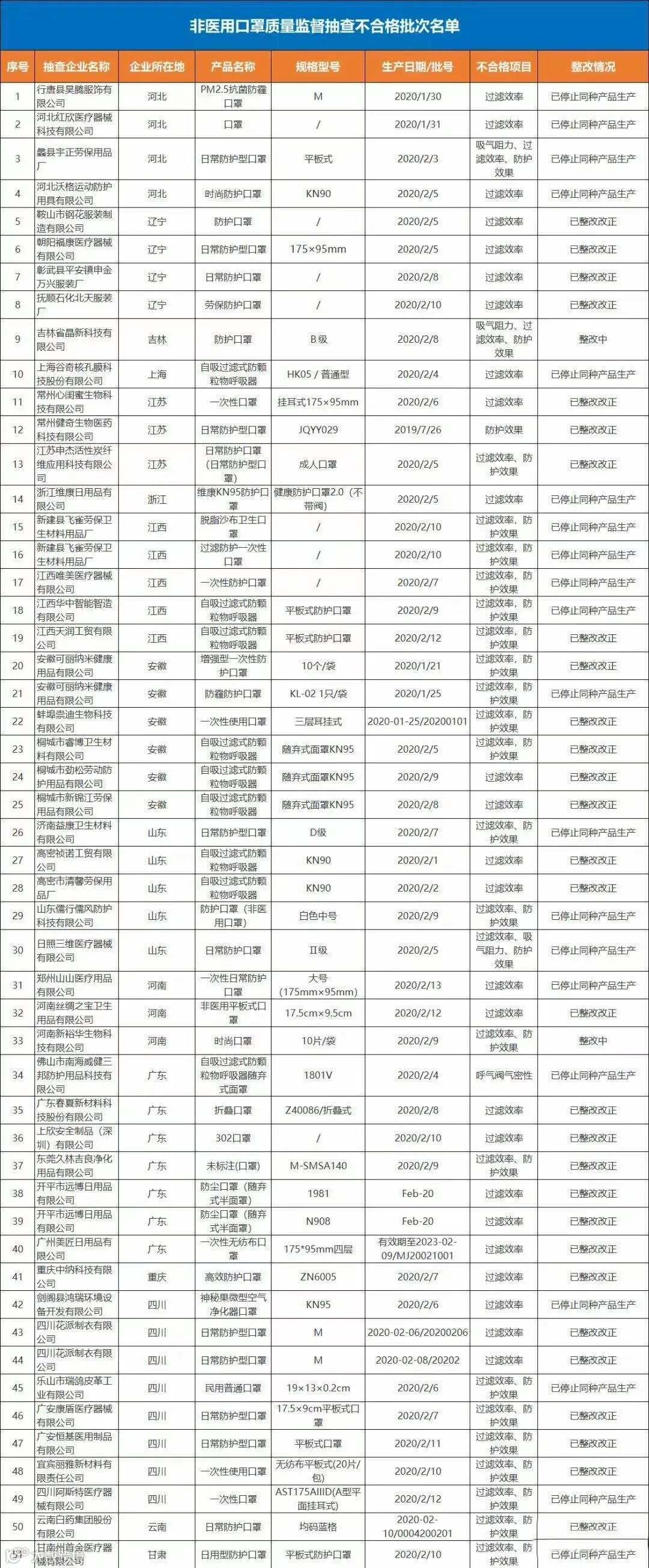 4月27日,市场监管总局公布了非医用口罩不合格名单