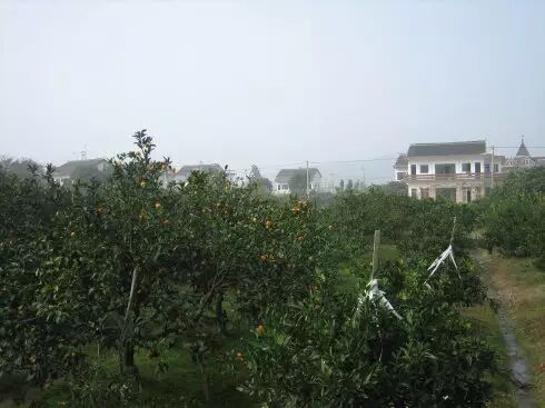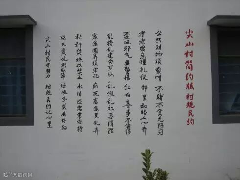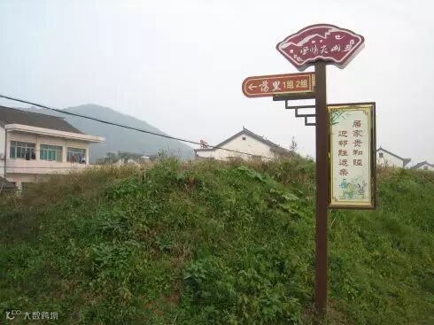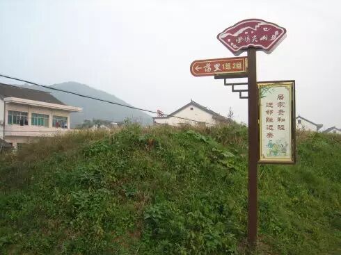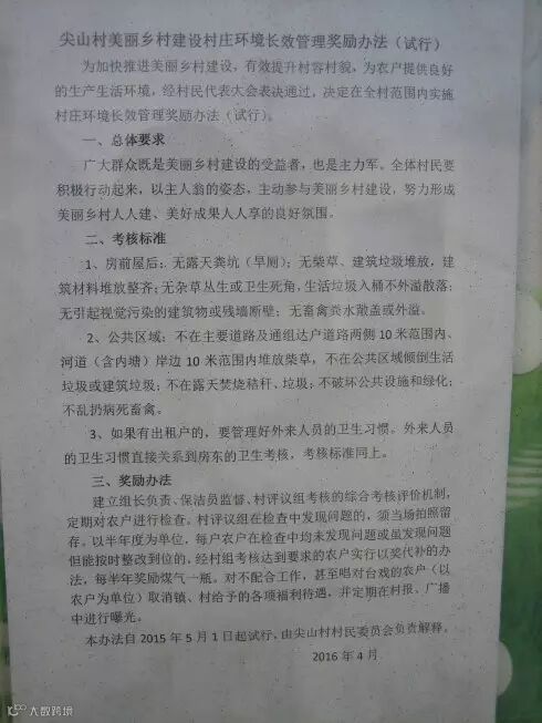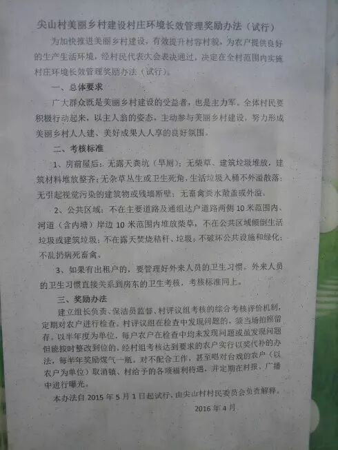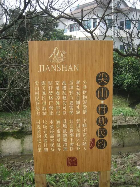 ——大尖山西北山腰和山脚下有不少果园(种有杨梅、桔子、枇杷等),附近的“农家乐”比较普及。这是树立在路口的《尖山村规民约》告示牌