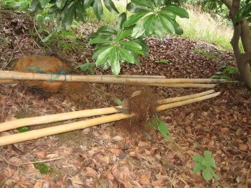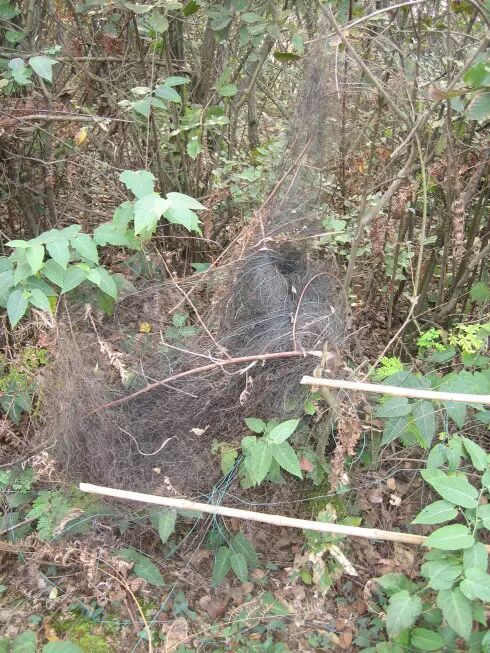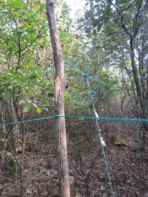 ——在一棵杨梅树下发现的3张被仔细绕在竹竿上的新的捕鸟网