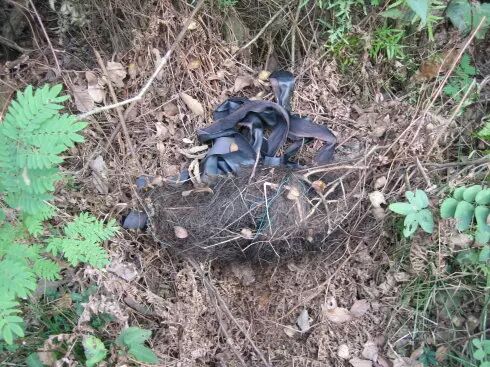 下午,对凤凰山的一小部分林地进行了初步巡视,发现和清除非法捕鸟(新)网11张(从网上解救并当场放生野鸟5只,点获死鸟3只);记录到遗留在山顶“鸟道”等处的之前已被拆毁的捕鸟网20余张/团;另在山腰的杨梅树上发现偷猎者隐藏的缠在长竹竿上的捕鸟网3张。