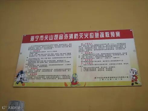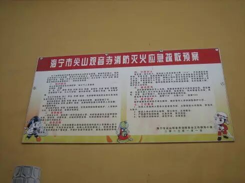 ——贴在建筑物外墙上的《海宁市尖山观音寺消防灭火应急疏散预案》