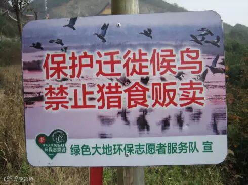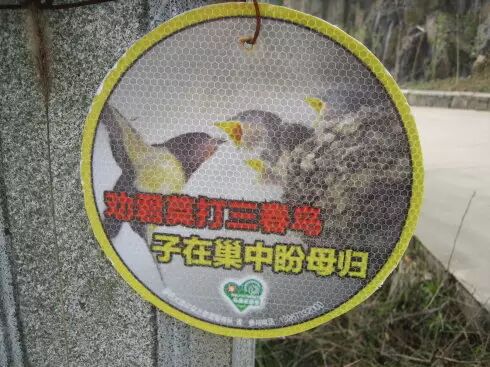 ——海宁当地的“绿色大地环保志愿者服务队”在大尖山观音寺景区内设置的“劝君莫打三春鸟,子在巢中盼母归”和“保护迁徙候鸟,禁止猎食贩卖”护鸟宣传牌