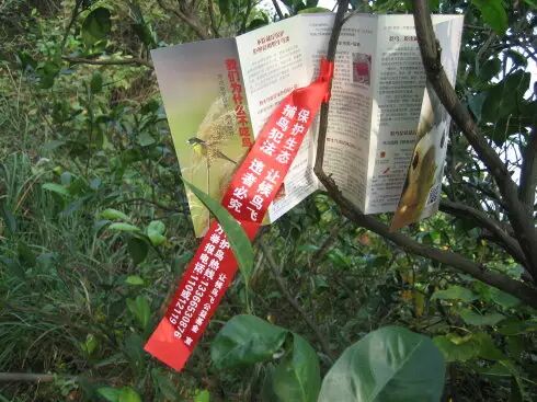 ——“让候鸟飞”公益基金工作人员在发现非法捕鸟网的山林间留下的护鸟宣传折页和印有“让候鸟飞”全国护鸟热线13366530876的红色警示布条。