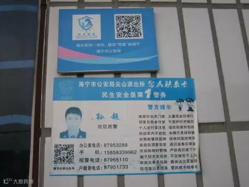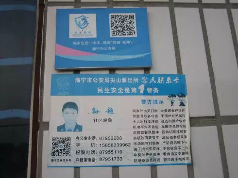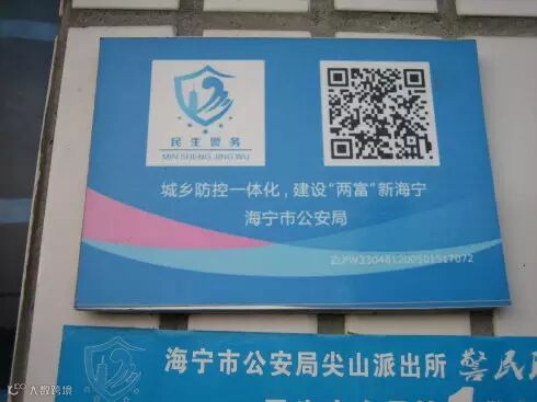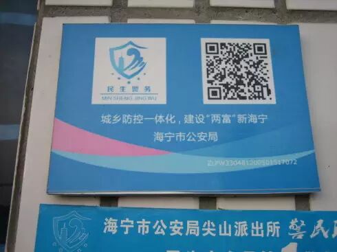 ——海宁市公安局(http://haining.jxgaj.gov.cn/)尖山派出所在尖山村民居外墙上贴的“民生警务”宣传牌,上面印有警方微信的二维码。