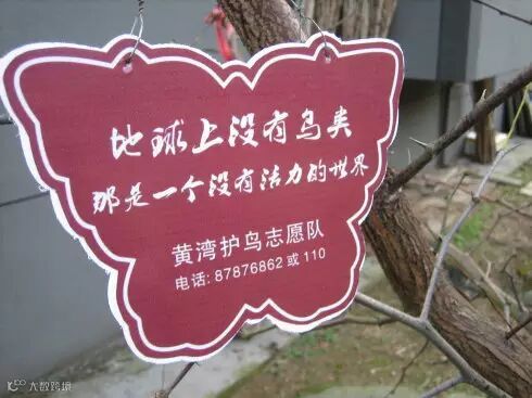 ——海宁有关方面在尖山村1组村民屋后通往凤凰山的小径旁一棵果树上悬挂的护鸟宣传牌。上面落款的“黄湾护鸟志愿者队”的联系电话(0573)87876862实为当地森林公安的座机。
