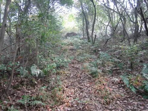 ——尖山观音寺北侧下方密林间被捕鸟人开出的张网“鸟道”和遗留在现场的之前被拆毁的捕鸟网网团
