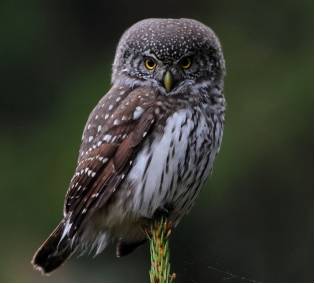 花头鸺鹠是体型最小的,体羽蓬松而饱满。灰色的头上满是白色小点斑,眼小而呈橘黄色,下体偏白而略具灰褐色纵纹。上体灰褐,具白点。翼及尾上多横斑。白色眉纹短,不甚清晰。