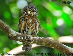 2.领鸺鹠幼鸟头无点斑,领鸺鹠亚成鸟头具点斑,胸及腹部具褐色纵纹,亚成或幼鸟褐色较重。而斑头鸺鹠亚成鸟或幼鸟头具点斑,胸及腹部具灰色纵纹,亚成或幼鸟灰色较重。
