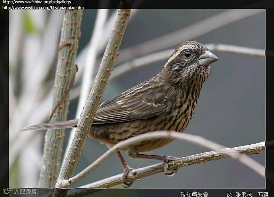 玫红眉朱雀雌鸟。上下体均具浓密的纵纹,眉纹及腹部色浅。朱雀属的雄鸟还是蛮好分辨的,雄鸟都有着大面积红色的羽毛,且都小小圆圆的。至于雌鸟就不太好辨认了。