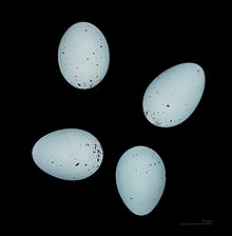 每窝产卵3-6枚,多为4-5枚。卵淡蓝绿色、被有褐色斑点,也有的被有黑色或紫黑色斑点,卵的大小为18.7-22.0mm×13.2-15.2mm。隔1天下1枚卵,孵卵完全由雌鸟承担,雄鸟在雌鸟孵卵期间寻食喂雌鸟,孵化期13-14天。