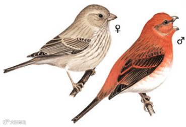 雄鸟体羽主要为红色,雌鸟则为褐或绿色;外侧尾羽无白色。