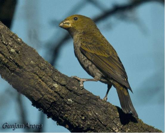 血雀雌鸟,上体橄榄褐色,下体灰,具偏深色的杂斑,腰黄。