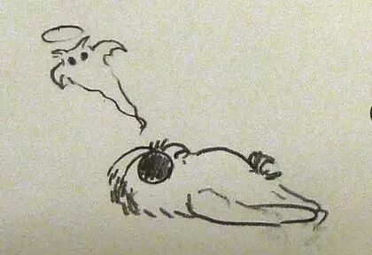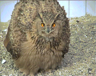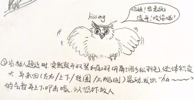 当人趋近是,突然鼓开双翼和尾羽(开屏)蓬松羽毛,使体积变大,并来回(左右/上下/转圈/不规则)晃动,发出“ha~~~~~~”的气音,并上下叩击喙,以恐吓敌人