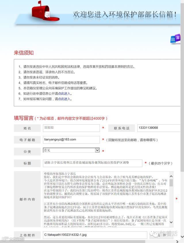 昨天是世界环境日,我们给陈部长写了一封公开信,呼吁,彻查江苏省盐城湿地珍禽国际级自然保护区在2012年的调整事宜,今日已通过网站递交。