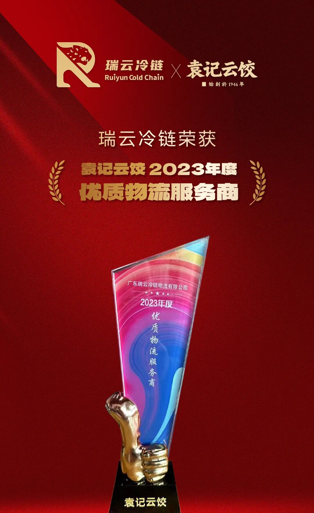 近日,在袁记云饺2023年承运商大会上,凭借「网络+平台」的线上线下一体化运营保障服务,瑞云冷链荣获袁记云饺“2023年度优质物流服务商”奖。