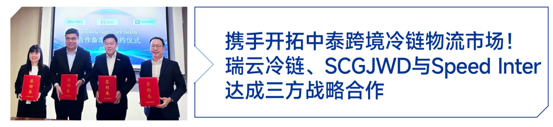 瑞云泰国公司由瑞云冷链、SCGJWD与Golden Line三方联合投资,融合了中国领先的冷链物流技术、泰国本土资源优势及跨境物流经验。这一战略合作通过共享仓储设施、运输网络、冷链物流数字化能力及客户资源,将加速构建高效、智能的中泰跨境冷链物流网络,助力两国农产品、食品等领域的贸易流通。