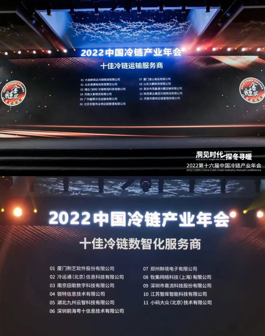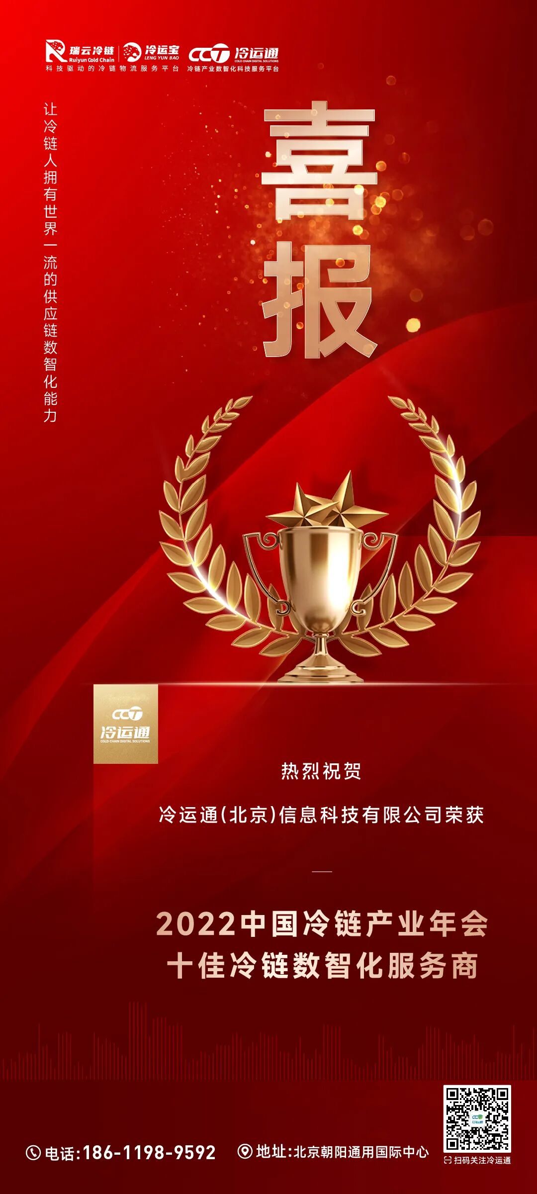 瑞云旗下冷运通凭借场景化、信息化、智能化的解决方案,荣获2021-2022中国冷链产业金链奖-十佳冷链数智化服务商。