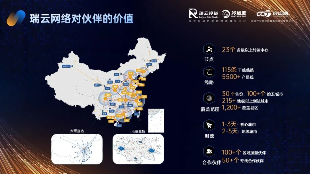 2023年瑞云将围绕“网络+平台”两个底盘能力建设,为盟商伙伴赋能6大价值。提供零担+整车的“全渠道、多场景、高竞争力”产品组合,满足生鲜食品流通的全场景物流需求。向盟商开放丰富、低成本、零费用截留的平台整车运力,提升市场竞争力。构建“线上+线下”立体化的获客渠道,为瑞云盟商伙伴扩大客户池、引流新业务。全国化零担网络帮助盟商承接本地客户的全国发货业务、异地逆向物流业务,承接KA客户的本地落地业务,助力瑞云盟商伙伴由区域物流向全国综合一体化物流服务商转变。自主研发的“冷运宝+星空系统+冷运通”的系统组合方案,可以全方位解决盟商与瑞云互流或自闭环供应链业务的多场景系统需求,提升盟商伙伴管理、运营、经营信息化水平。还为优秀加盟商提供了向瑞云事业合伙人晋升的事业发展通道,共享瑞云股权与资本红利的长期价值。