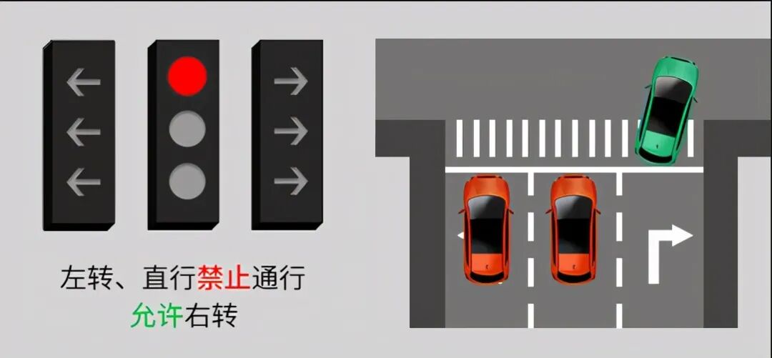 与上面左转指示灯会亮起左转箭头不同,当左转箭头灯和圆盘灯都是红灯,右转箭头灯不亮时,意味着只允许右转。