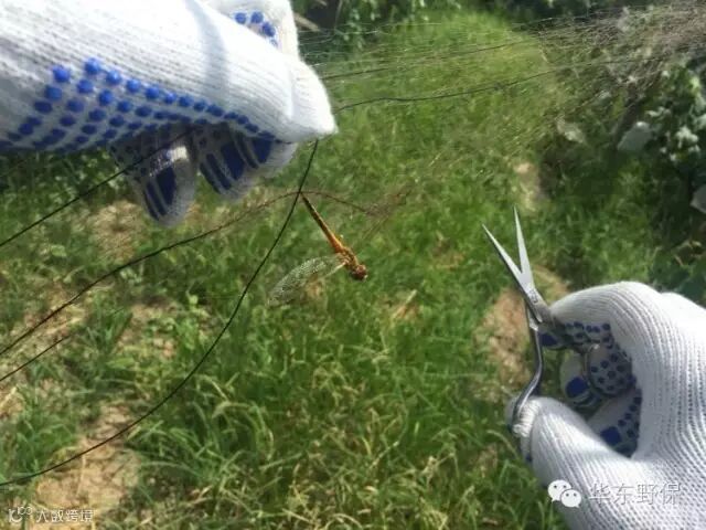 在解网时,一只蜻蜓正在网上,刚触网,将其解救放飞了。摄影:周征一