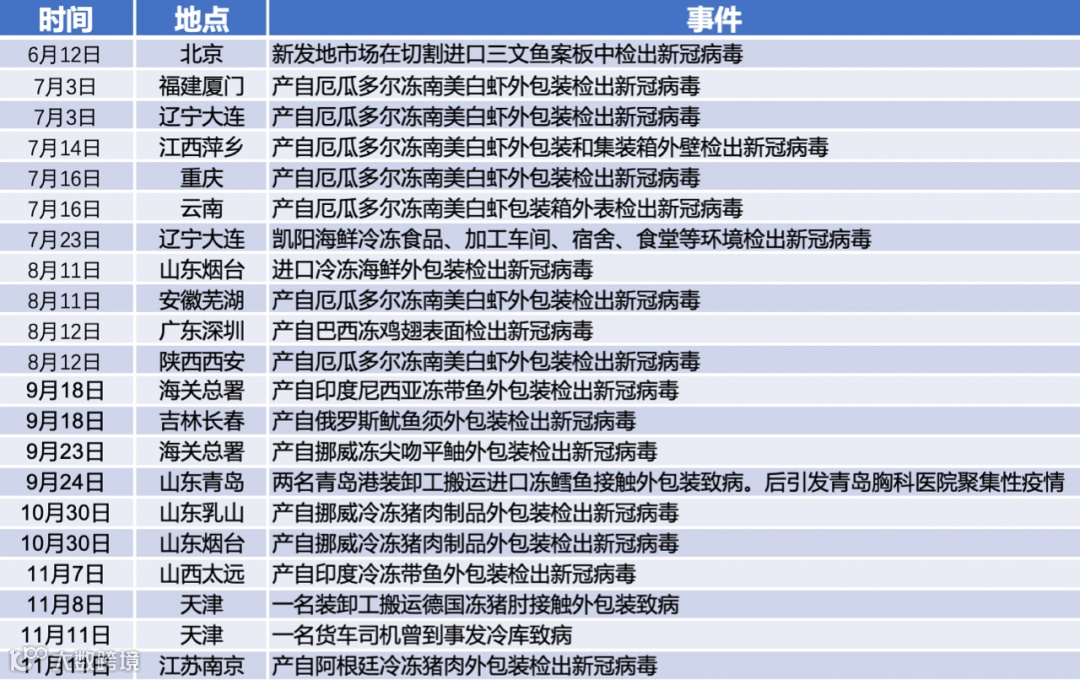 从上述整理的部分事件可以看出,带来的新冠病毒主要源自进口食品,并在冷链物流过程中进行跨境长途传播。