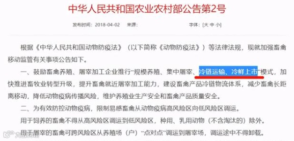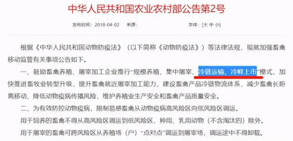 2018年,农业农村部发布《中华人民共和国农业农村部公告第2号》,针对跨省调运活禽做出了更严格的规定,鼓励规模养殖,集中屠宰,限制畜禽调运。里面就主要提到了“冷链运输、冷鲜上市”。