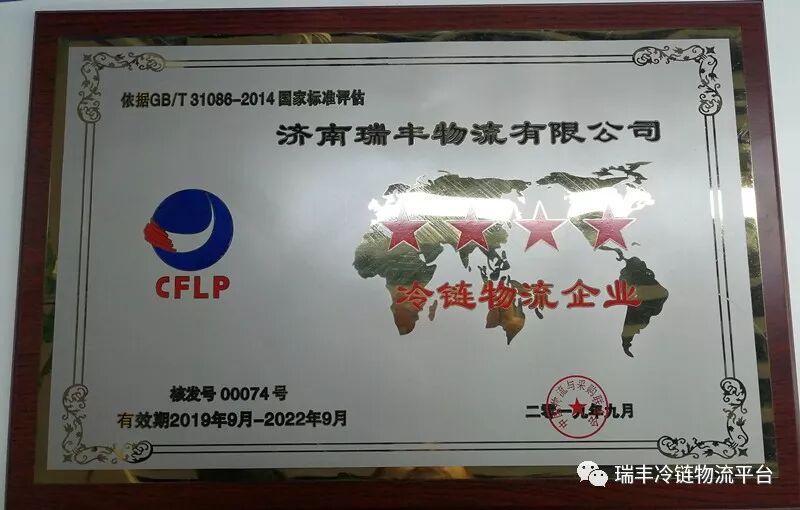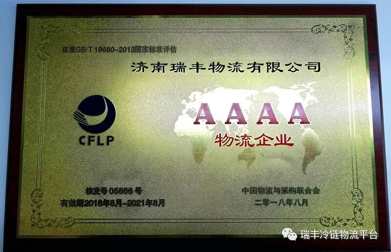 作为冷链物流企业,行业资质非常重要,瑞丰物流有限聚焦连锁餐饮业半成品仓储及冷链物流服务,依据GB/T31086-2014国家标准评估为4星冷链物流企业,依据GB/T19680-2013国家标准评估为4A物流企业。
