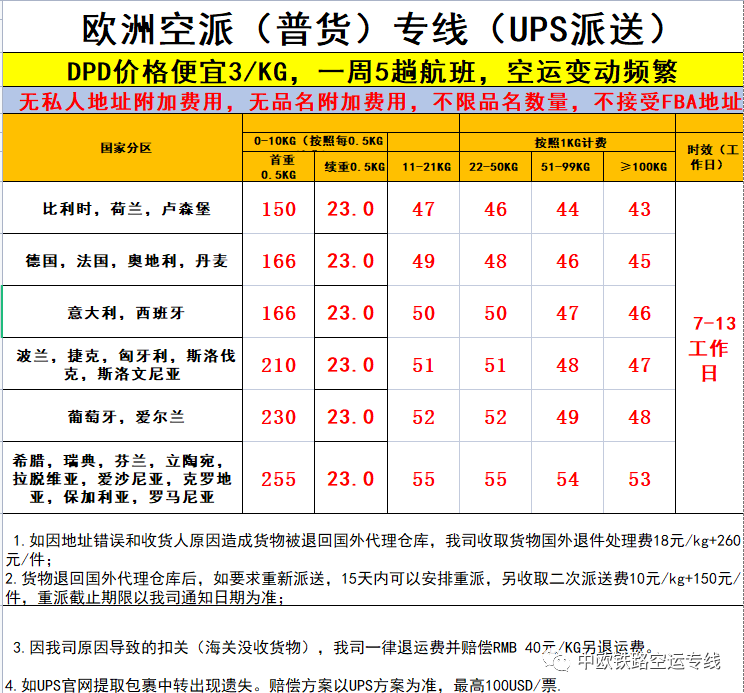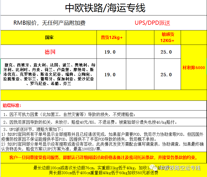 中国货物铁路,空运到欧洲六国(英国,法国,德国,西班牙,意大利)。 欧洲ups派送到门,包税清关,无需客户支付任何税费。