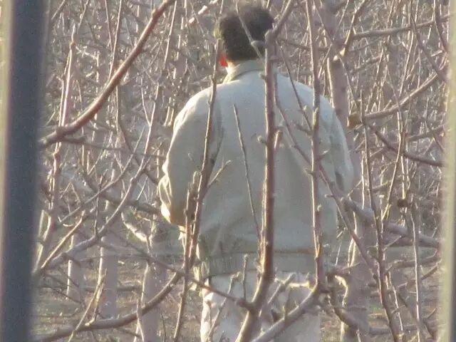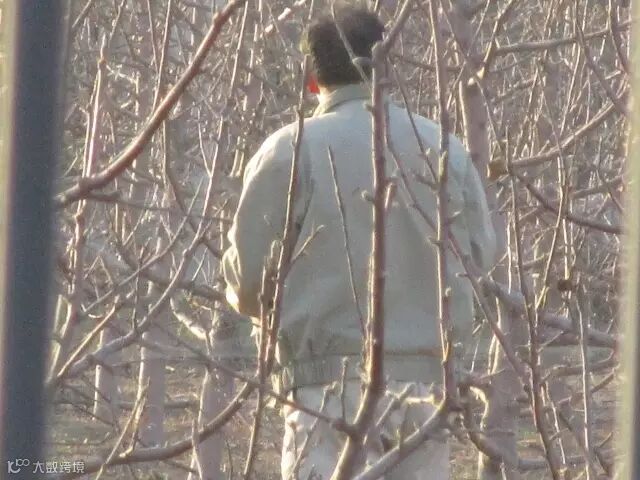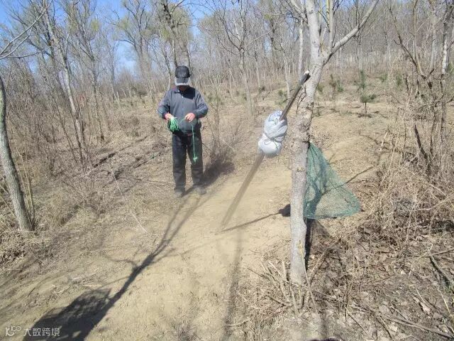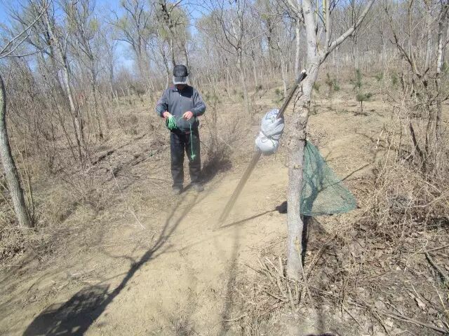 次日早晨9点,在另一处果园西侧,发现又一非法捕鸟人,现场三张30米长的粘网,树上挂着四个鸟油子(燕雀、煤山雀、黄眉鹀、蜡嘴雀)。