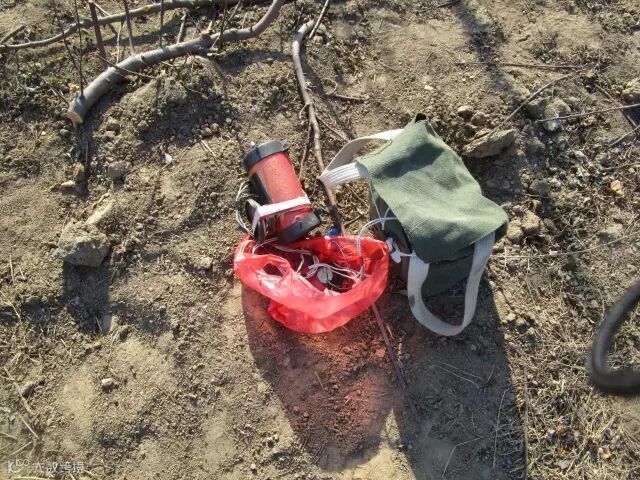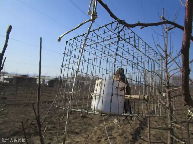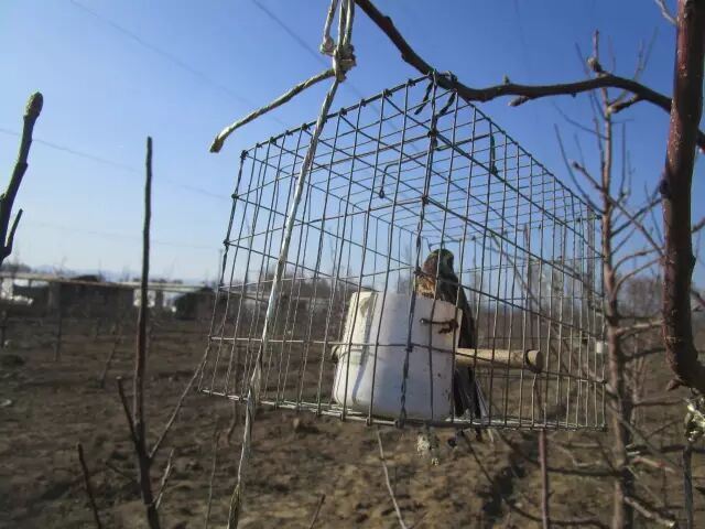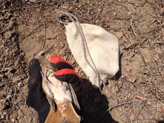 3月24日,在事发果园的南缘,发现四张粘网(每张长30米),网边挂着四个笼子里边都是鸟油子(黄眉鹀和燕雀),网下放着一个大电瓶通电电煤机,播放鸟鸣吸引鸟儿撞网。树下用绳子拴住脖子的红尾鸫已被放飞。