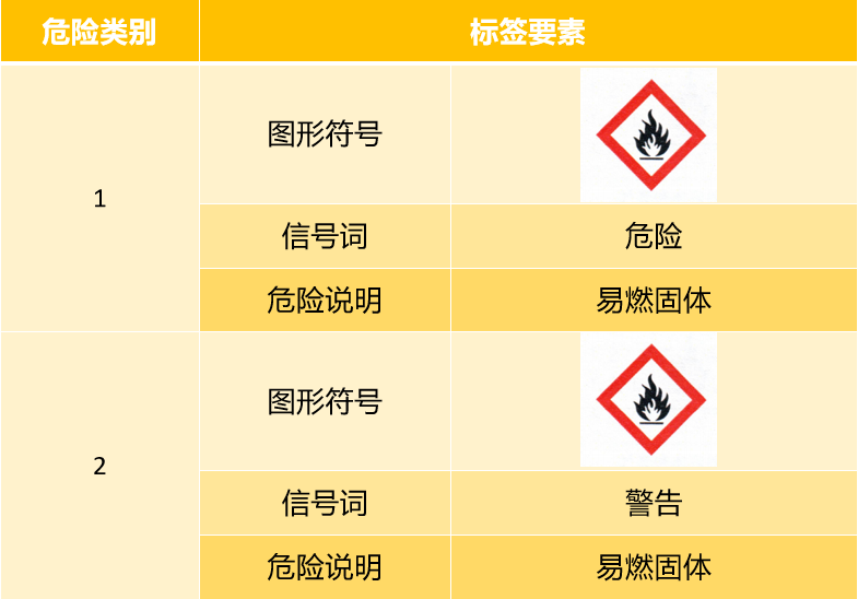 对于易燃固体的标签,危险类别都以指定的象形图、信号词和危险说明的顺序列出。联合国《关于危险货物运输的建议书 规章范本》(第十七修订版)涵盖的危险种类或类别应在标签中列出每个类别的指定相应图形标志。